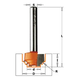 Fraises profilées classiques - Profil E - D : 12.7 - d : 8.4 - R : 1.2 - l : 12.7 - L : 50.8 - S : 6 - Rotation : DROITE